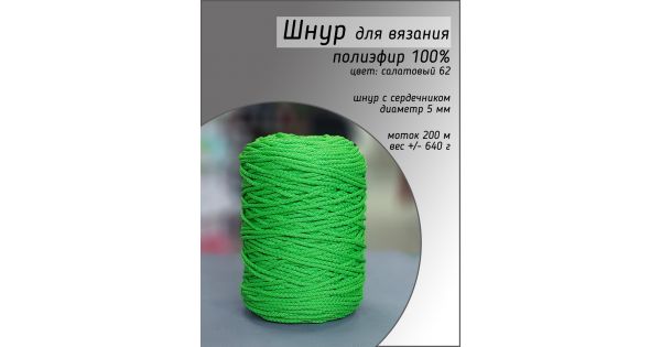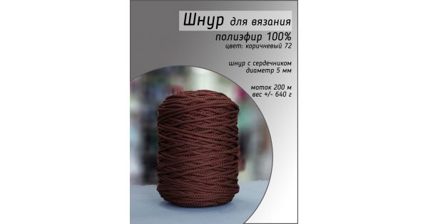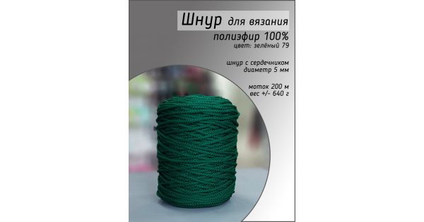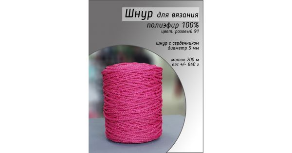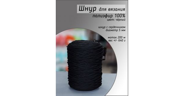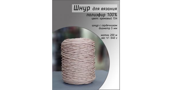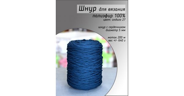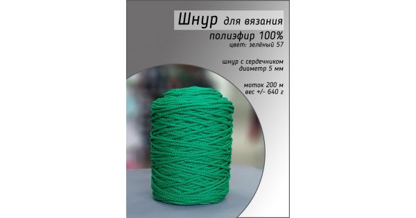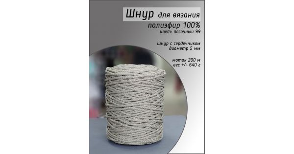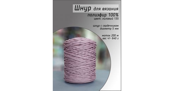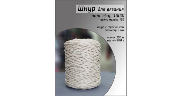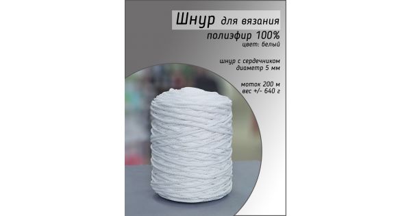 Качественный полиэфирный шнур с вязаным сердечником от белорусского производителя используется для вязания сумочек, авосек, корзинок, подставок, салфеток, ковров, подушек, пуфов и других изделий. Шнур по всей длине без узлов, отлично держит форму готового изделия, не выцветает. Длина шнура в мотке 200 м, диаметр 5 мм, состав 100% полиэфир. Рекомендуется для вязания использовать крючки и спицы размером 5-10 мм.